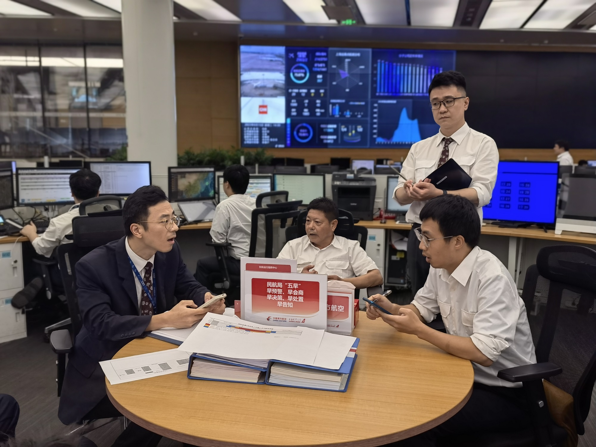 “喂,您好,這里是東航運行指揮中心(東指中心),請講……”在東航運行及客戶中心決策區的席位上,運行經理陳春益正一手接起電話,一手拿起筆在筆記本上唰唰地記錄著。電話那頭通報情況的語速很快,陳春益大腦飛速運轉,眉頭隨著筆尖的飛舞而漸漸緊鎖……而就在此刻,他旁邊的幾個座機又接二連三地響了,兩個助理小伙兒趕緊暫停各自手頭的工作,迅速接起了電話……