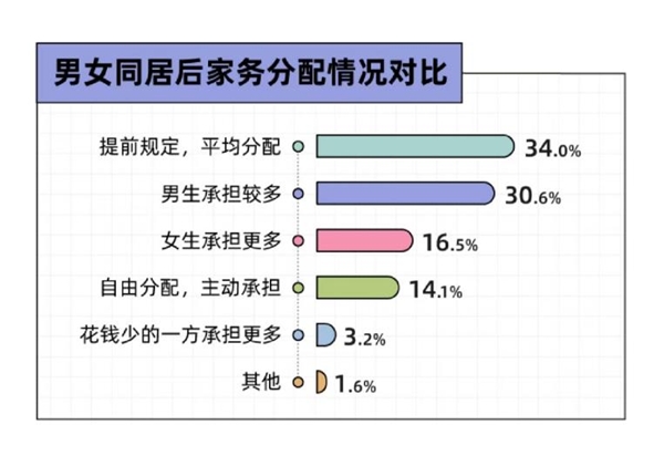 令人意外的是,《報告》顯示,“男生承擔更多家務”的比例為30.6%,高于女生(16.5%),完全顛覆了刻板認知。此前的一項調查也顯示,同居后,男生們的“居家能力”大幅提升,提升幅度甚至超過女生,不過在結婚后又會有所下降。