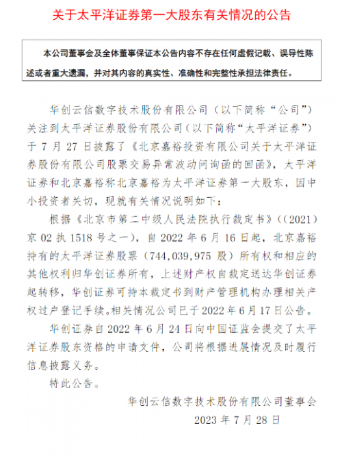 7月28日,華創(chuàng)云信發(fā)布公告稱,根據(jù)法院執(zhí)行裁定書,自2022年6月16日起,北京嘉裕持有的太平洋證券股票7.44億股所有權和相應的其他權利歸華創(chuàng)證券所有,上述財產(chǎn)權自裁定送達華創(chuàng)證券起轉移,華創(chuàng)證券可持本裁定書到財產(chǎn)管理機構辦理相關產(chǎn)權過戶登記手續(xù)。