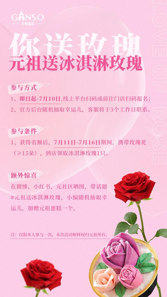 即日起至7月10日,線上平臺掃碼或前往元祖門店掃碼報名即可參與。官方后臺會隨機抽取幸運兒,獲得名額后7月11日-7月16日攜玫瑰花到店領取冰淇淋玫瑰,為愛人獻上夏日專屬的甜蜜美味。參與活動后,在微博、小紅書、元社區曬圖,帶話題#元祖送冰淇淋玫瑰#,還有機會獲得元祖蛋糕一個。