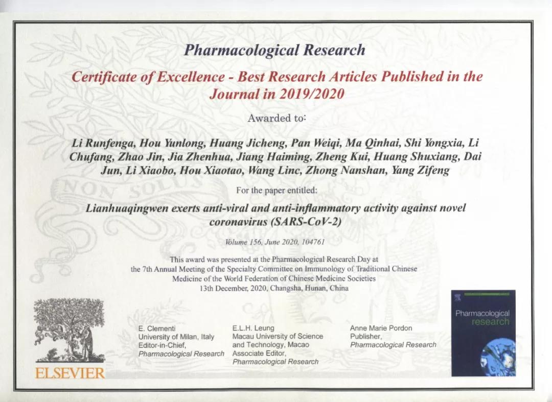 論文《連花清瘟對新型冠狀病毒具有抗病毒、抗炎作用》被國際期刊《藥理學(xué)研究》評選為2019-2020年度全球優(yōu)秀論文獎