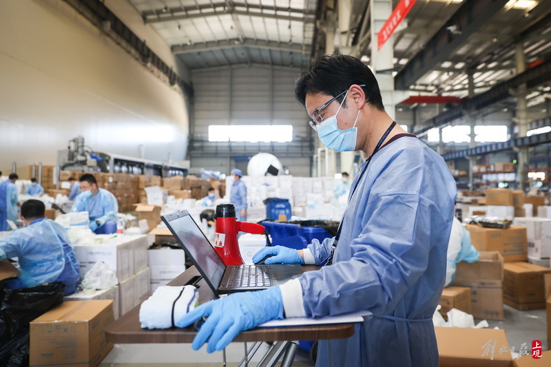 2022年4月11日,上觀新聞?dòng)浾邅?lái)到業(yè)績(jī)路上的寶山防疫服務(wù)包最大的分裝車間,這里原本是上海漢虹精密機(jī)械有限公司的生產(chǎn)廠房,但該廠百余名志愿者從早上八點(diǎn)就開始分批次投入到了防疫物資的分裝“流水線”作業(yè)中,一張張清單核對(duì),一件件物資分裝,現(xiàn)場(chǎng)熱火朝天。