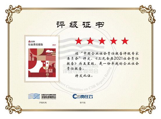 近年來,三元食品始終保持與利益相關方充分交流與溝通。2022年,三元食品發布的第8份年度社會責任報告,并連續四年獲評中國企業社會責任報告評級專家委員會"五星級"評價。評級專家委員會評價,《北京三元食品股份有限公司2021社會責任報告》是一份卓越的企業社會責任報告。