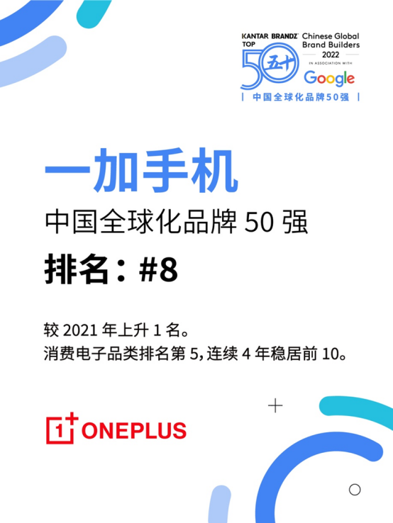 2022年7月27日,凱度攜手谷歌發(fā)布《2022凱度BrandZ?中國(guó)全球化品牌50強(qiáng)》。其中,一加手機(jī)排名第8,同時(shí)也在消費(fèi)電子品類排名第5,總排名相較21年上升1名。憑借優(yōu)質(zhì)的產(chǎn)品體驗(yàn)和獨(dú)特的品牌氣質(zhì),一加手機(jī)已連續(xù)6年蟬聯(lián)該榜單,且連續(xù)4年穩(wěn)居前10。